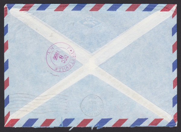 Reverse of cover has handstamp and machine cancellations from Fayetteville, New York, both postmarked December 8, 1965. Cover was redirected to its proper destination of Fayetteville, North Carolina.